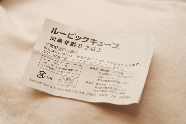 無印良品のルービックキューブ。2100円の札が見える。早速開けてみよう。