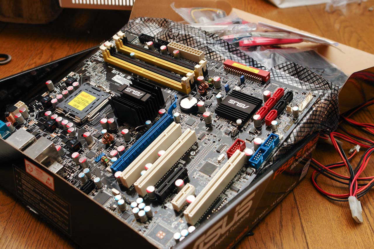 マザーボードは今一番人気、といってもいいAsus(エイスース)のマザーボードP5B-E plus。2.2万円ぐらい。
