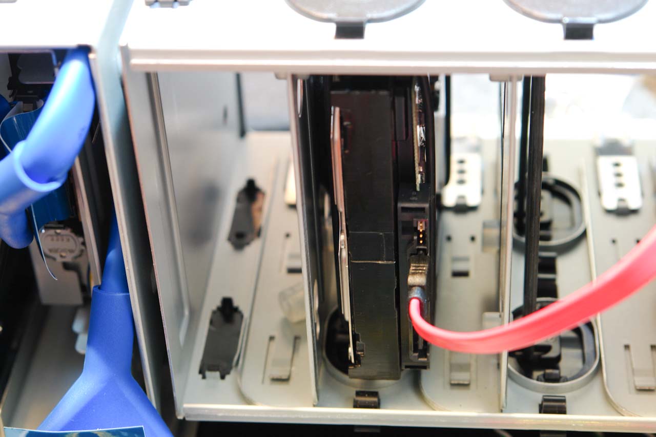 左上の電源も後ろのねじを4つ外せばスコッと背面からすぐに取り出せる。 右下のハードディスクたちもねじを2つ外せばスコッと取り外せる。