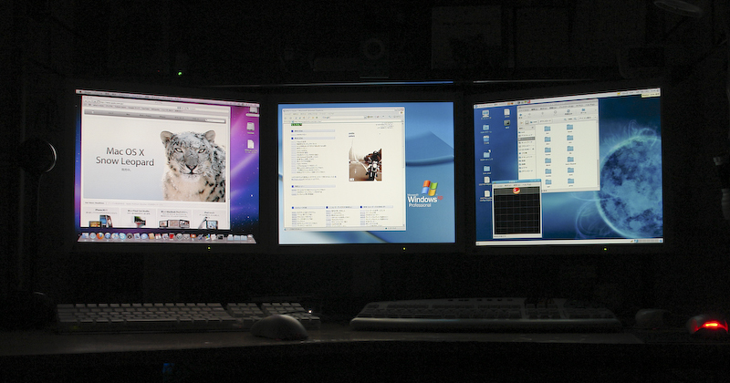 こんなふうに18.1インチx3画面。これはこれで便利でした。ナナオ+NEC+ナナオの3枚の液晶を並べてはみましたが、