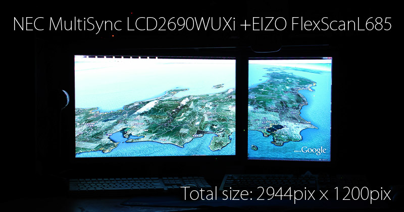 画面サイズはNECが1920x1200、ナナオが1024x1280なので、合計で横が2944px、縦が約1200pxということになります。