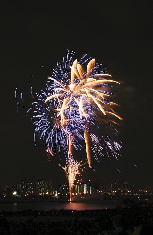 個人的にはこういう変則的な花火も味があると思っている。打ち上げられたときはインパクトが足りないのだが、写真にすると生け花っぽい。