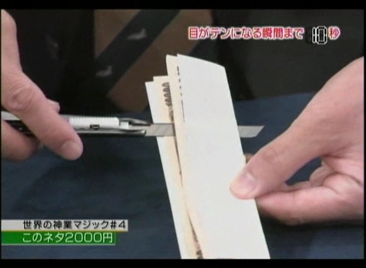 カッターでお札と白い紙を切ったけど、広げてみると5000円札は切れてなかった!という手品。
