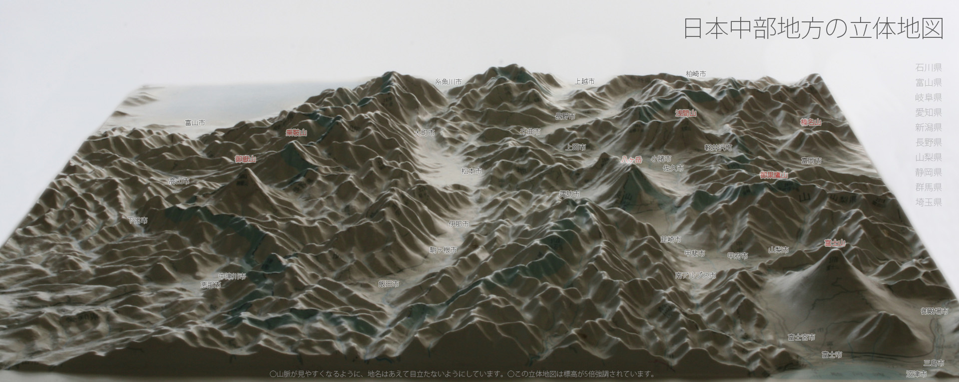 題して、「日本中部地方の立体地図」です。こうして見渡すと石川県・富山県・岐阜県・愛知県・新潟県・長野県・山梨県・静岡県・群馬県・埼玉県の10県が立体的に写っています。立体的、というよりは鳥瞰図(ちょうかんず)っぽいといったところでしょうか。