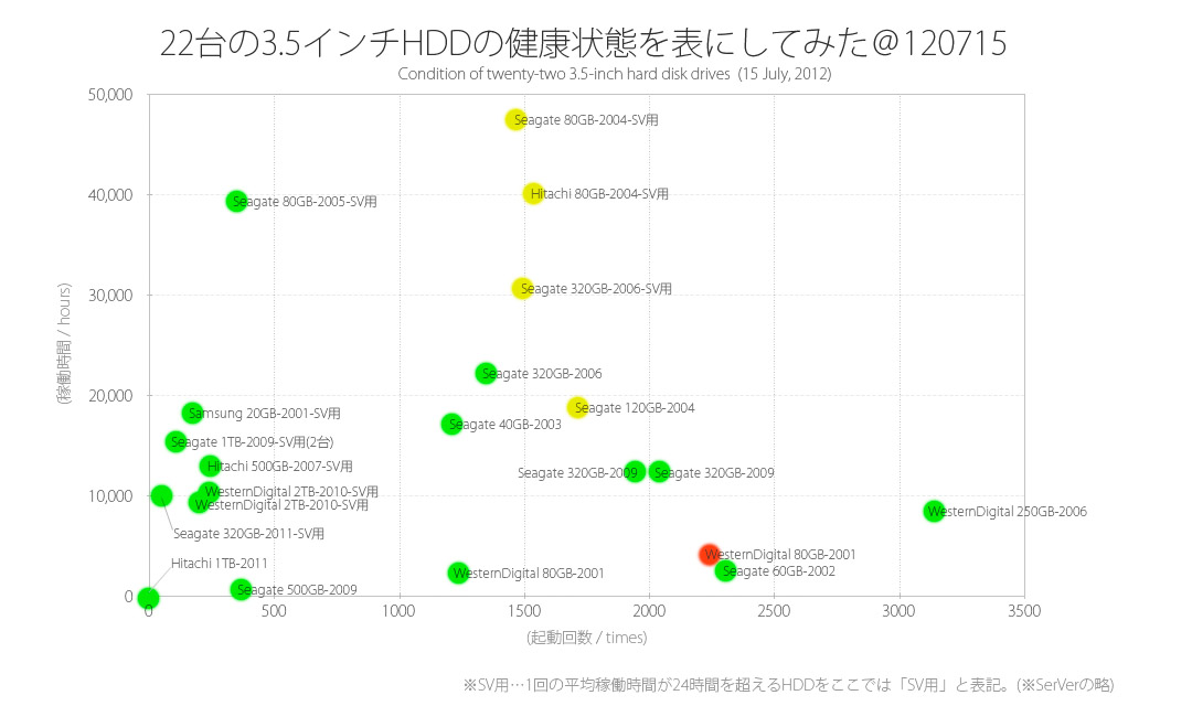 22台なので推測の域を脱しないけど、「3.5インチHDDは3万時間を超えると怪しいかも」という表になりました。