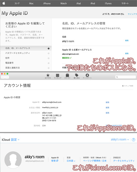 オレ「あ、確認ですが、本来はapple.comとicloud.comとAppStoreなどのIDは同期されるのですか?」