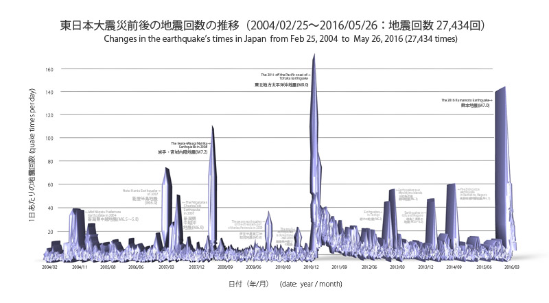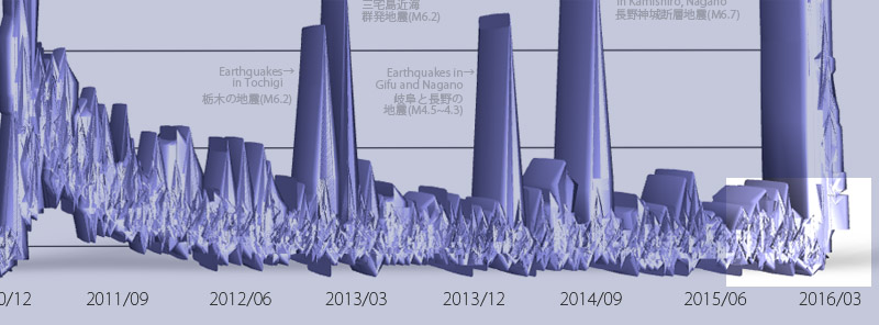 2011年に東日本大震災(3.11)の地震が起きた後、 17283回の地震をグラフ化して世の中に公開していた私ですが、2016年に起きた熊本地震が思いのほか余震が多いことが気になりました。