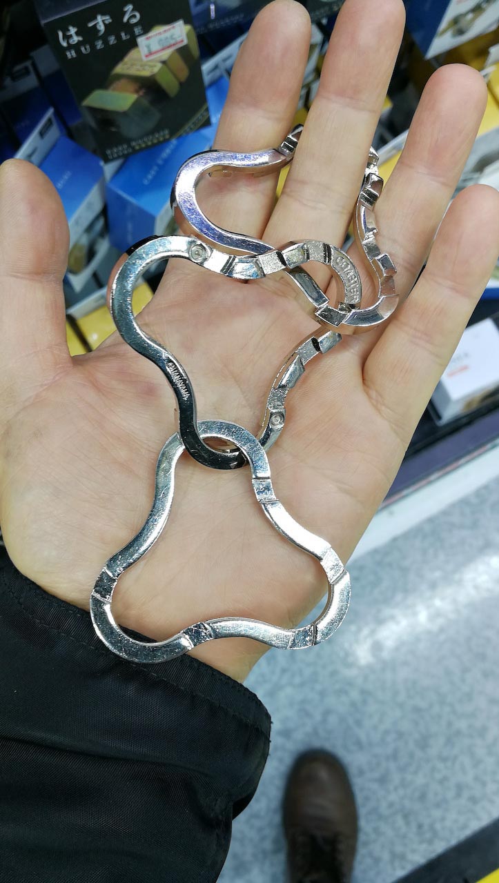 数珠つなぎになった3つのリングに窪みがあり、うまく重ねると完成するようです。